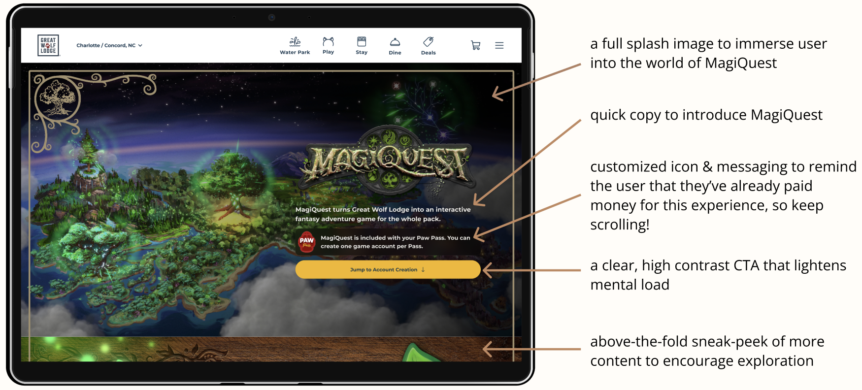 I was both the product owner and sole designer of this project. I created, from scratch, a digital customer onboarding flow for MagiQuest, the most popular attraction at Great Wolf Lodge (GWL) aside from their waterpark. By moving more of the onboarding online rather than in the store, we could shorten in-store lines, getting more people excited to play MagiQuest and more visibility on MagiQuest upsells. GWL anticipated a multi-million dollar revenue increase from this project.